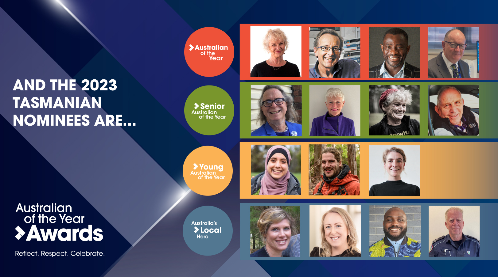 They are just some of the 16 people in the running to be named the Tasmania Australian of the Year, Tasmania Senior Australian of the Year, Tasmania Young Australian of the Year and Tasmania Local Hero.